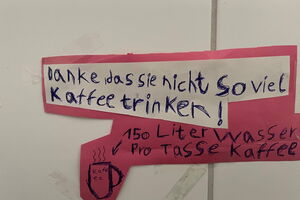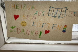 Wie von Zauberhand hängen im ganzen Schulgebäude Erinnerungsschilder für den Klimaschutz.